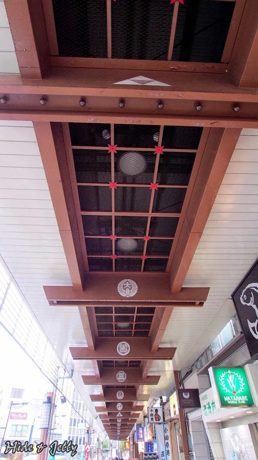 前往小田原城可從東口出站(車站內標示相當明顯),東口對面的商店街,屋簷上由北条家的家徽為代表的各家臣家徽,說明了北条五代對小田原至今的影響,屋頂燈具的四周還有忍者的飛鏢唷!