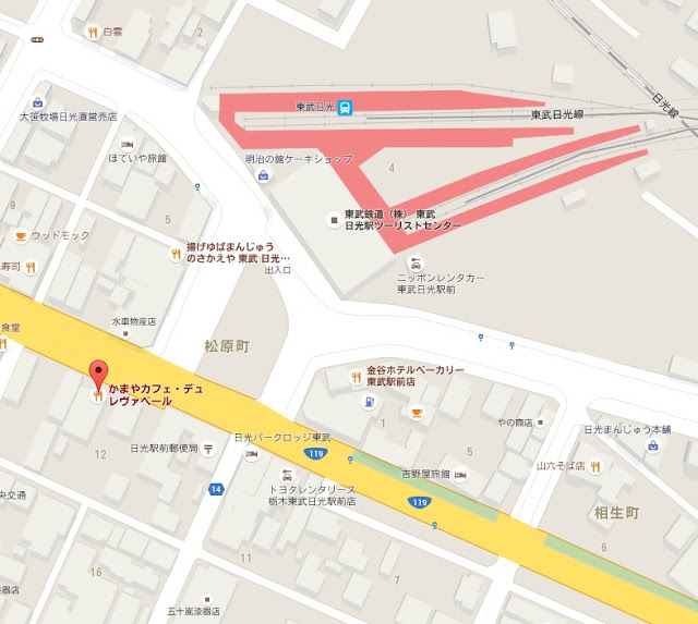 首先是這間位於東武日光駅前的「かまやカフェ・デュ・レヴァベール」,紅磚的外觀,如果沒有左上那個大大的咖啡背與刀叉標誌,還真的以為是郵局還是政府單位之類的建築物呢!