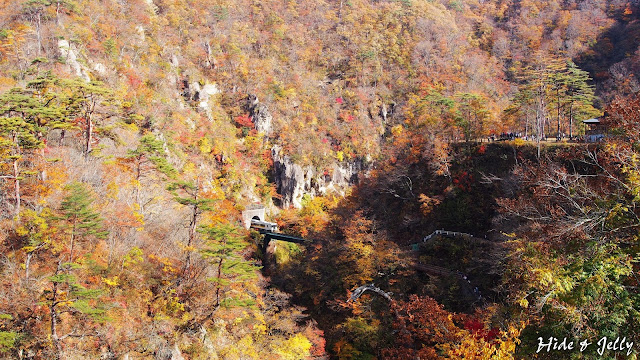 走進鳴子峽的展望台,一眼望去,是深深的山谷與滿山的紅葉,不過似乎晚了一些時間,若是早個一週來,可能還不會有已經掉光樹葉的枯枝....