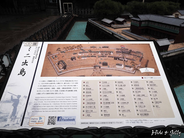 此處的兩個看板,右邊的說明了出島當時禁止除了遊女與僧侶外的日本人進入,也禁止荷蘭人出來的張貼佈告,左邊的看板則是說明了出島的範圍以及扇形面積的空拍照。