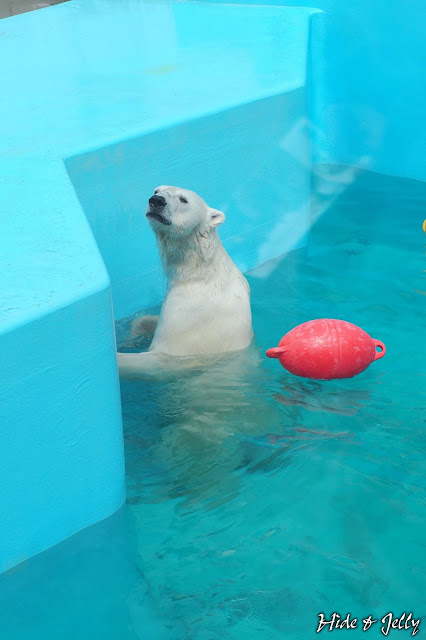 下午1點15分,北極熊餵食秀要開始了,還好我們也沒有走遠,這時北極熊ミルク(牛奶)已經迫不及待的在籠舍的門前踱步了。