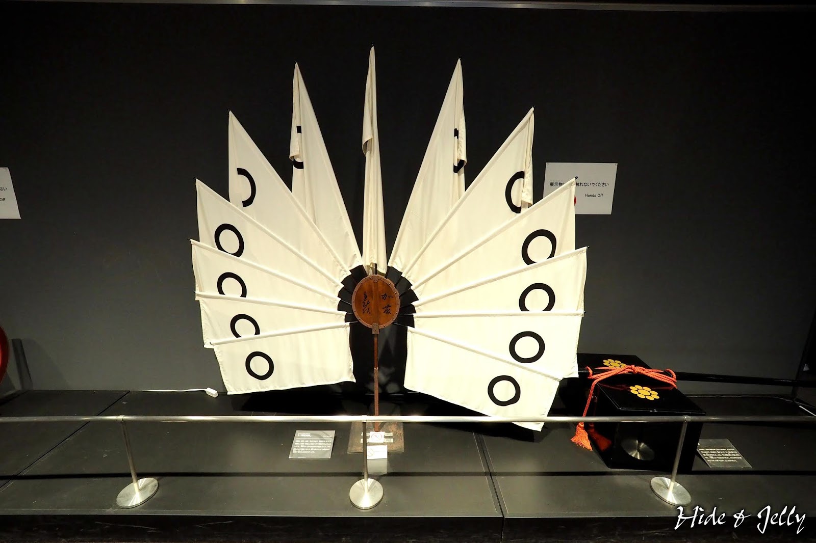 視聽室的後方,還有很帥氣的十三隻加藤蛇の目紋指物所拼成的的本陣旗,一旁則是細川九曜紋的盒子。