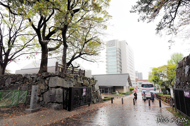 通往本丸區域,會先經過「大手先門跡」,如今已看不出門跡的樣子了,一旁的石垣看起來也是後世修築,後方還有市政府的現代化玻璃帷幕大樓。