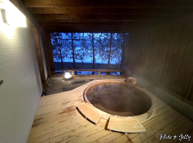 更衣室裡面就是熱氣蒸騰的檜木浴池了,因為不是小小的一人使用檜浴桶,兩個人泡絕對是足夠的寬敞,太熱的話還可以直接坐在一旁的檜木板上冷卻,半露天的形式,也讓窗外的支笏湖空氣得以與風呂內的熱空氣交換,所以就算在裡面泡滿整整一小時,也是不會悶熱頭暈的唷,加上窗外的湖光粼粼,實在是相當舒服的溫泉風呂啊。