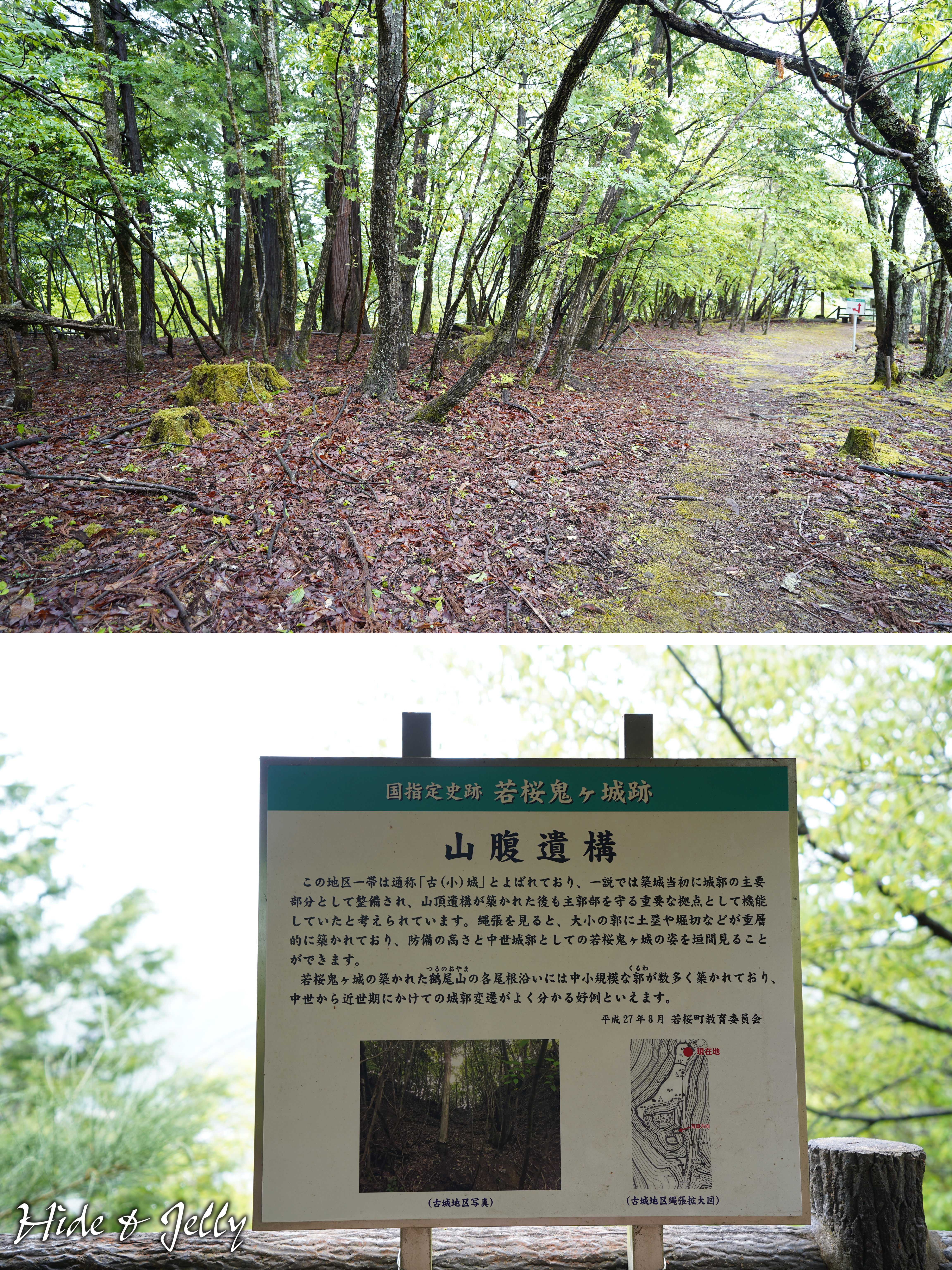 大約爬了25分鐘後,來到山腹地區,這一片平坦的區域是最初築城的主要部分,也稱為古(小)城區,有許多土壘與堀切的存在,是中世山城的構造,山頂的主郭部,可視為在古城區後方的守備據點,從山腹往山頂爬,剛好可以將中世、近世城郭逐一體驗。